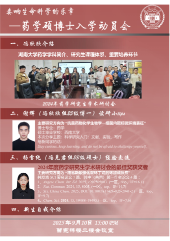 会上,冯老师热烈欢迎2025级药学新生,系统介绍了湖南大学药学学科作为校内唯一医学博士点的多个研究方向及显著成果,详细讲解了研究生课程体系、开题、论文与答辩等培养环节,并隆重介绍了药学研究生的学术研讨会,鼓励新生夯实基础、勇于创新。随后,25级博士新生谢辉(导师冯欣欣)以“科学研究入门:文献、实验、写作”为主题,结合自身研究生经历,分享了读研期间的实用经验。他鼓励新生“保持好奇,持续学习,勇于挑战自我”,为科研之路注入动力。同时,会议特别邀请了2024年度药学研究生学术研讨会“最佳奖”获得者杨雪纯师姐(导师冯见君)进行经验交流,她用三段故事分享了自己的科研心路,回顾了初次参与科研合作时的探索,强调团队交流带来的共赢与成长;讲述了面对实验失败与自我怀疑的经历,在坚持中重新找到方向;分享了在“反应停事件”的启发下,持续努力迎来意外收获的惊喜。她鼓励新生不畏困难、主动合作、坚守初心。目前她已参与发表SCI论文7篇,其中(共)第一作者论文4篇,为新同学们树立了优秀榜样。